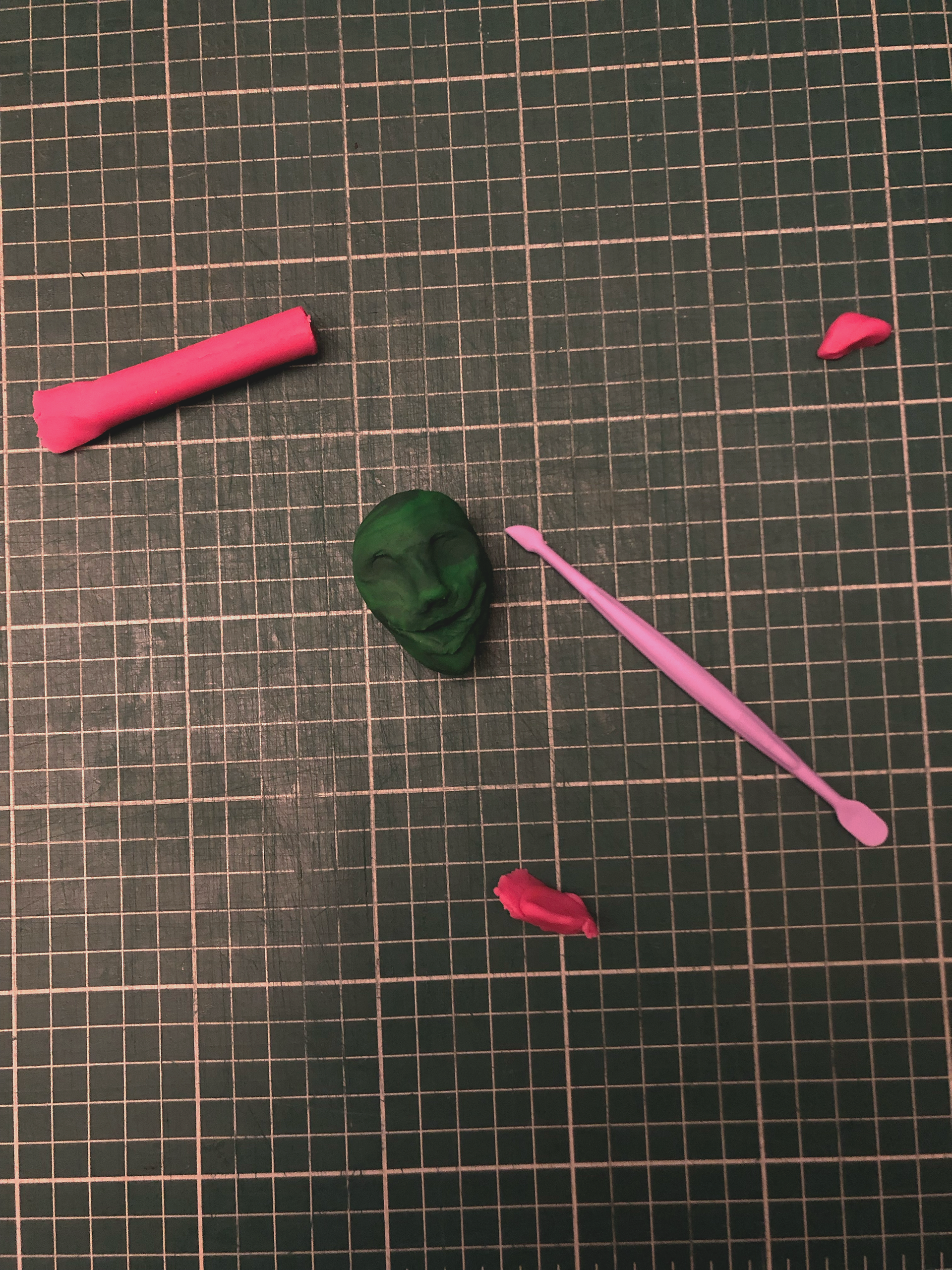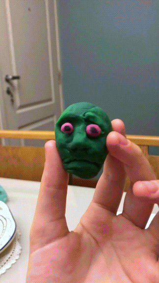 Double faced head made out of clay. Photos of it rotating every 30 degrees were taken to make a photo sequence.